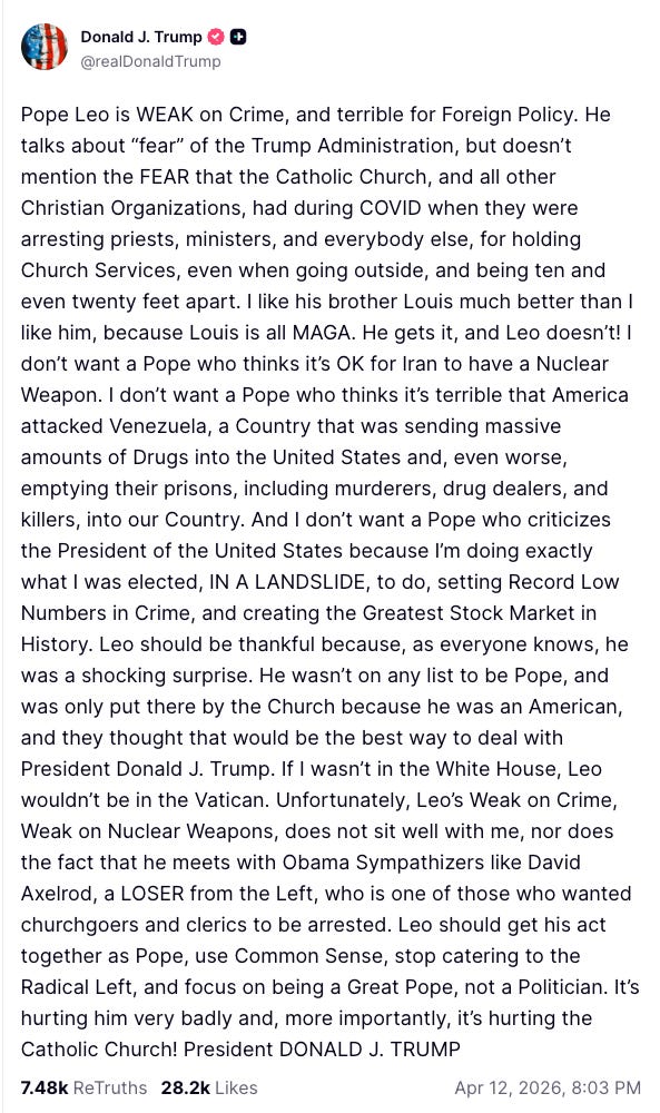 He also kept his beef with Pope Leo going for some reason.