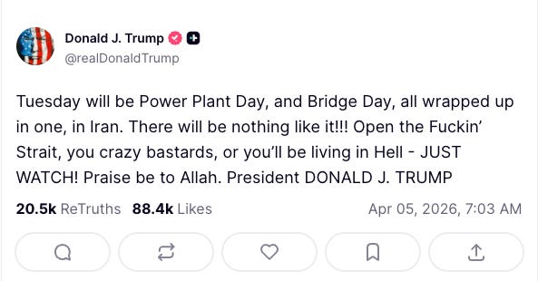 Unsatisfied with the mindshare Jesus of Nazareth was receiving on Easter, he posted about his ongoing war in Iran, threatening: